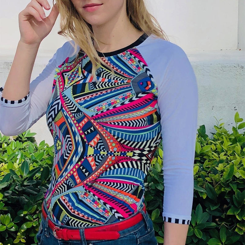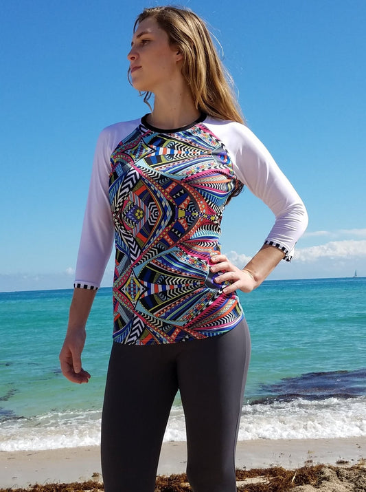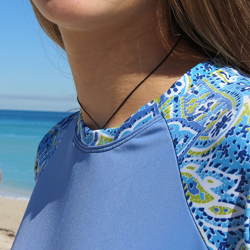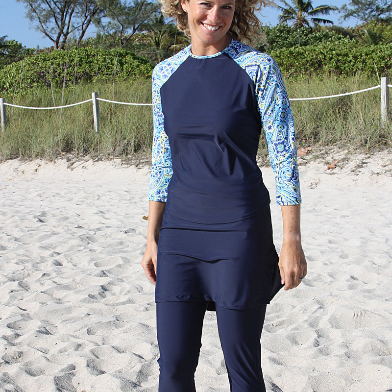 Explore modest swimsuit tops featuring stylish designs, color combinations and all sleeve lengths.